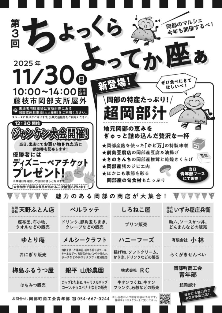 なお、11/30の日曜日は、藤枝市岡部支所で開催される「第3回ちょっくらよってか座ぁ」に出店します。殿のお店はお休みになりますが、岡部の魅力満載のマルシェへ、ぜひお越しください。